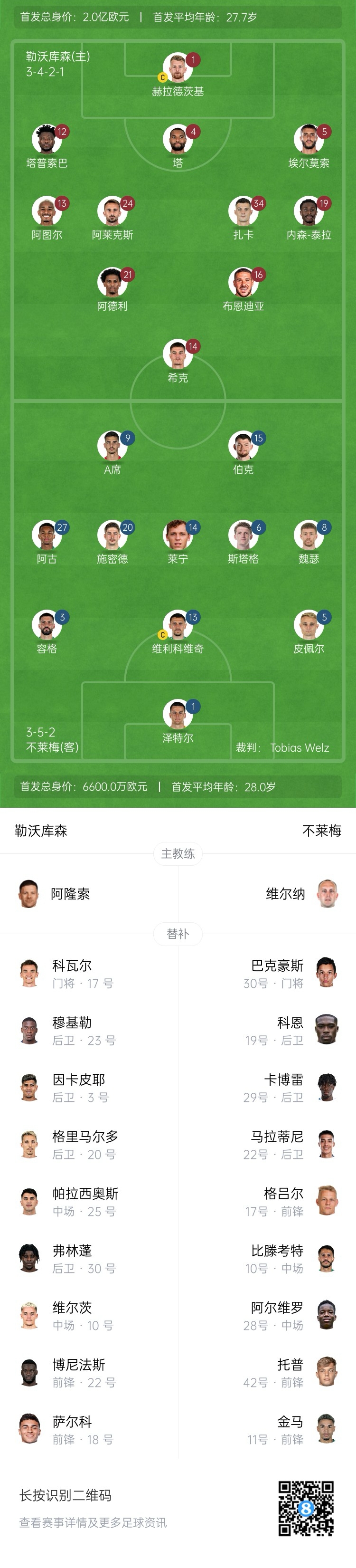 勒沃庫森替補(bǔ):17-科瓦爾、3-因卡皮耶、10-維爾茨、18-薩爾科、20-格里馬爾多、22-博尼法斯、23-穆基勒、25-帕拉西奧斯、30-弗林蓬