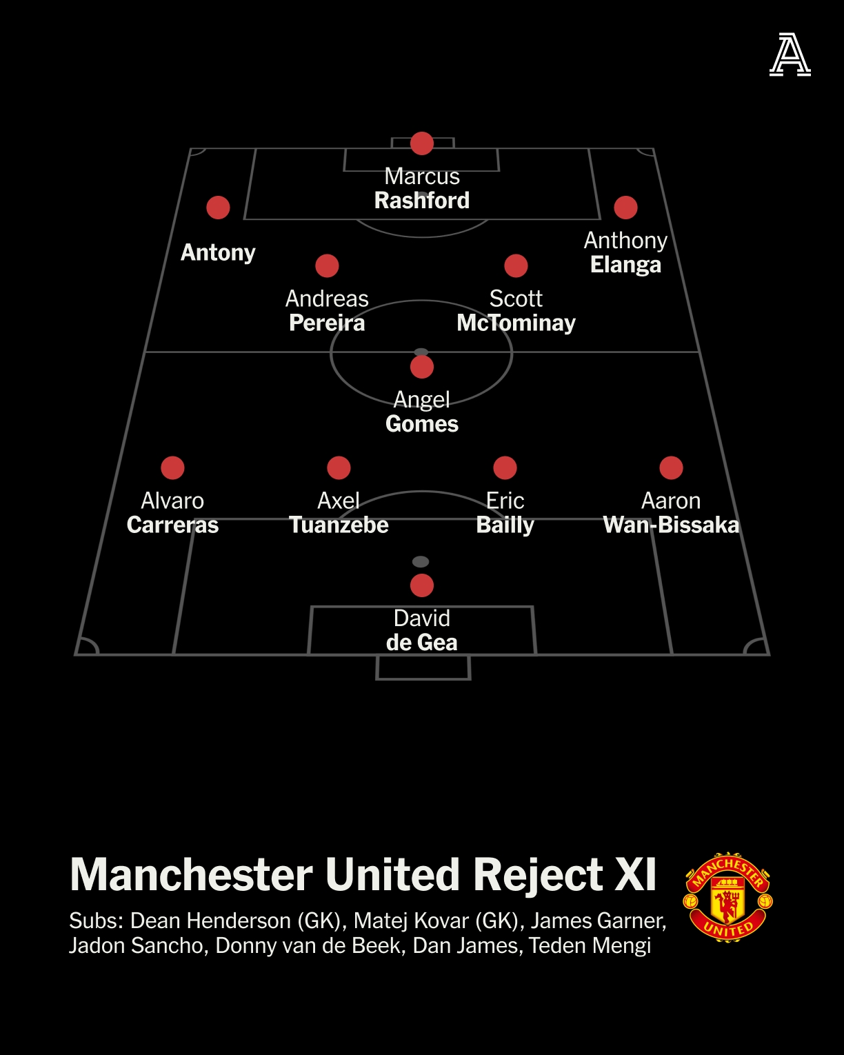 曼聯(lián)棄將隊首發(fā):德赫亞;阿爾瓦羅-費爾南德斯、圖安澤貝、拜利、萬-比薩卡;安赫爾-戈麥斯、佩雷拉、麥克托米奈;安東尼、拉什福德、伊蘭加