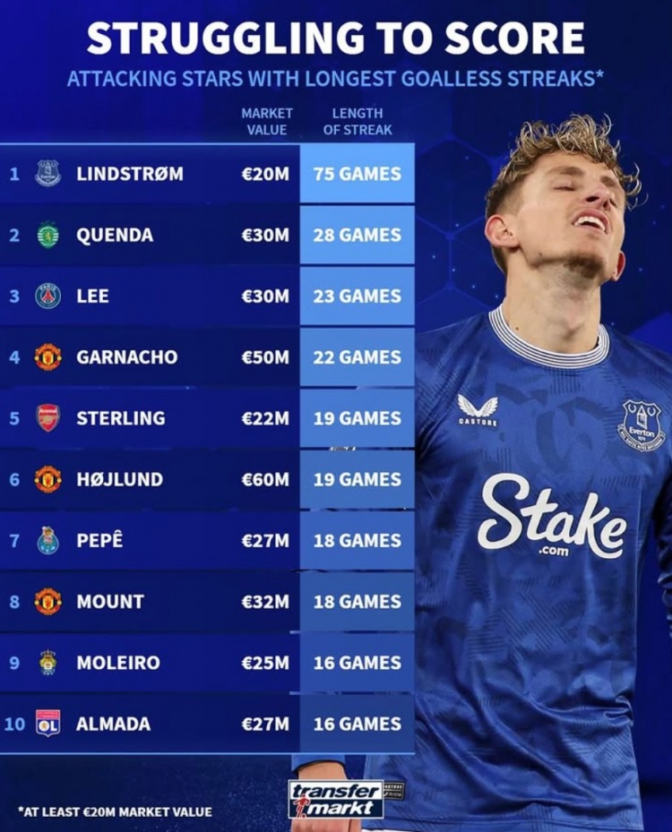 3月8日訊 《轉(zhuǎn)會市場》統(tǒng)計(jì)了當(dāng)前身價(jià)超過2000萬歐元的攻擊手當(dāng)前進(jìn)球荒情況,林德斯特倫斷崖式居首。