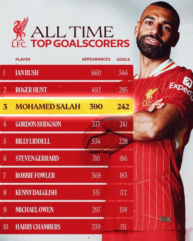 本場比賽取得進(jìn)球后,薩拉赫已經(jīng)為利物浦打進(jìn)242球,躋身紅軍隊史射手榜第三位。