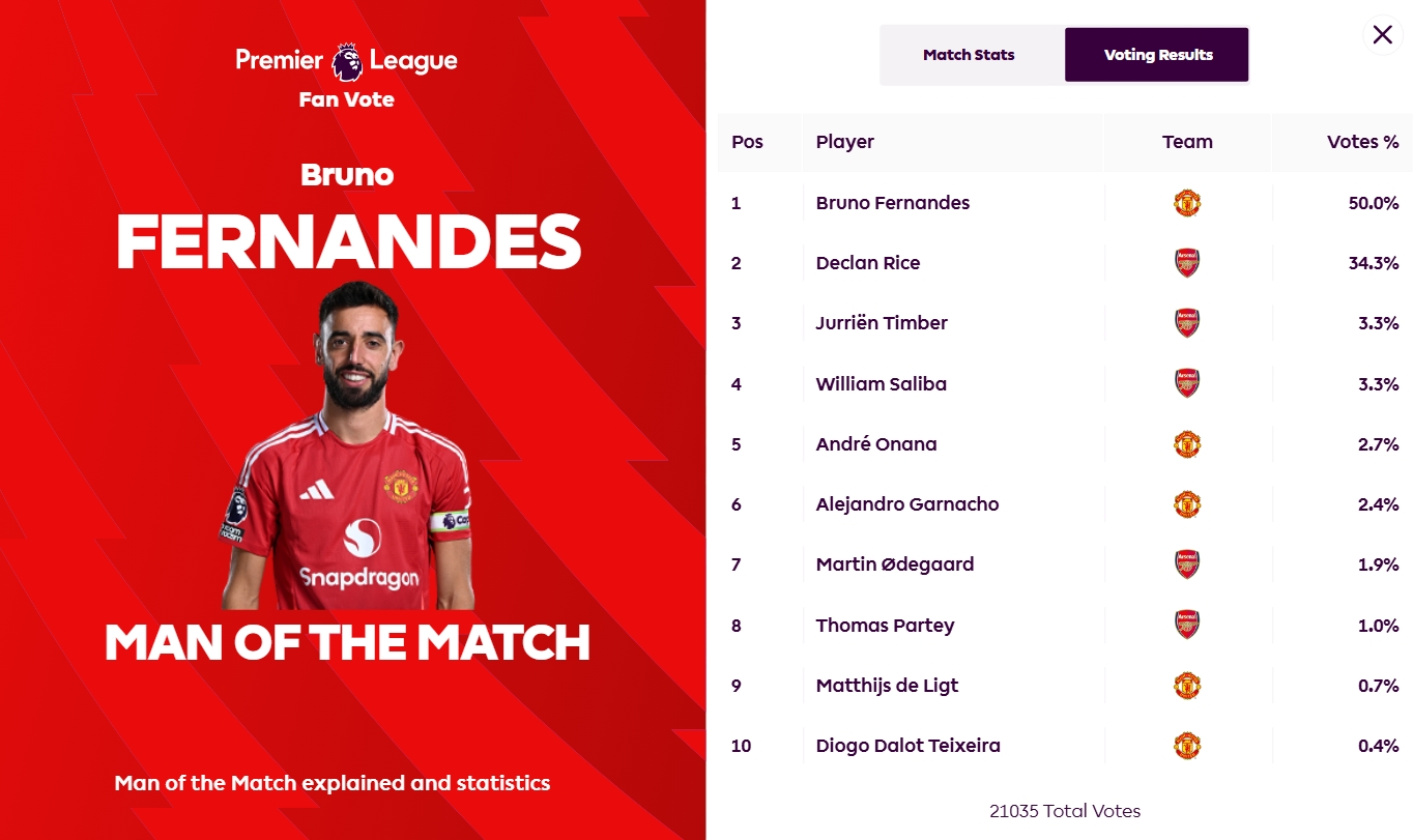 本場(chǎng)比賽,B費(fèi)打入一個(gè)任意球世界波,為曼聯(lián)首開(kāi)記錄,賽后他獲得50%的票數(shù),被評(píng)為全場(chǎng)最佳。