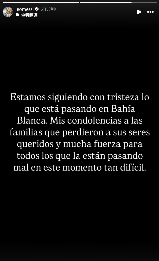梅西寫道:“我們懷著悲痛的心情關注著bahía blanca正在發(fā)生的事情,我向那些失去親人的家庭致以哀悼,也希望所有在這個艱難時刻正經(jīng)歷困境的人能擁有力量。”