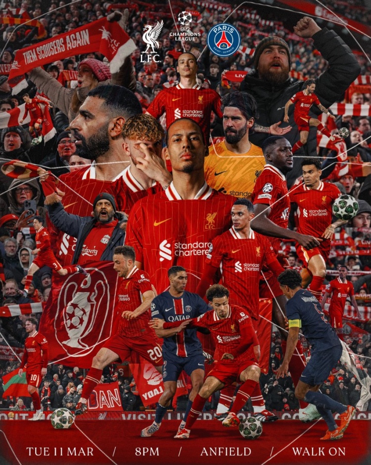 利物浦曬主場對陣巴黎海報,范迪克C位&兩隊多名球員出鏡