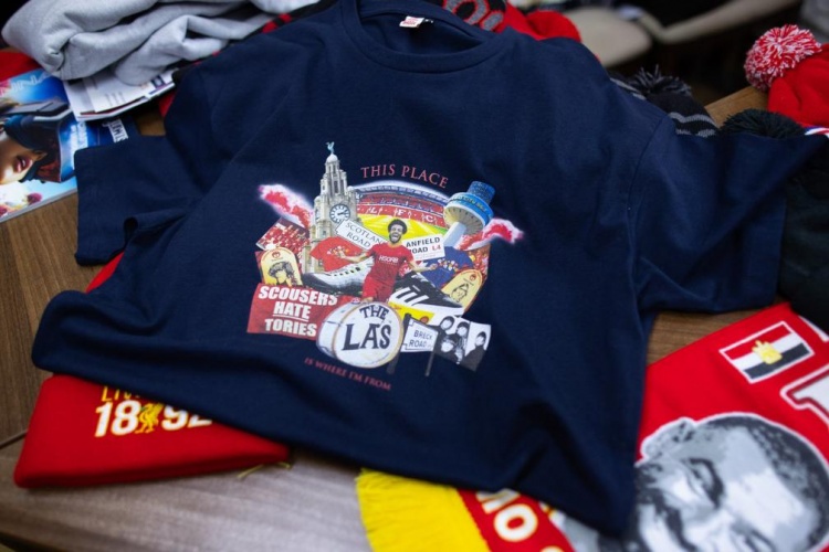 在距離利物浦主場安菲爾德只有5分鐘步行路程的一家商店里,你可以看到當(dāng)?shù)卣诔鍪垡患?0鎊的T恤,上面印有目前利物浦這座城市的標(biāo)志:樂隊披頭士和The La's、地標(biāo)性建筑皇家利物大廈和利物浦電臺城塔,以及薩拉赫。