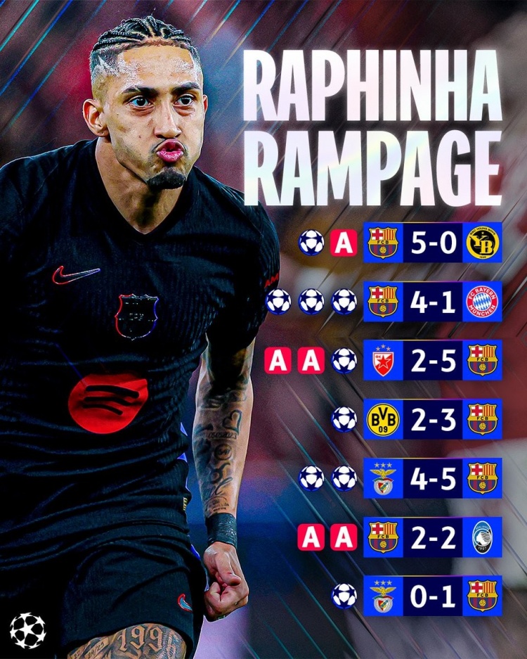 拉菲尼亞本賽季9場歐冠有7次參與進(jìn)球,共計(jì)9球5助攻&戰(zhàn)拜仁戴帽