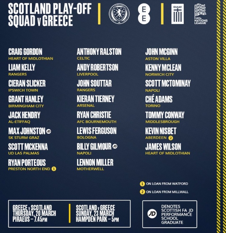 3月11日訊 即將到來的歐國聯(lián)A聯(lián)賽升級賽,蘇格蘭將和希臘進行兩回合的比賽。目前,蘇格蘭已經(jīng)公布了大名單,羅伯遜、麥克托米奈領銜,蒂爾尼在列。