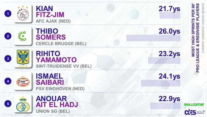3月11日訊 數(shù)據(jù)分析機(jī)構(gòu)SkillCorner統(tǒng)計(jì)比甲和荷甲高速?zèng)_刺能力排行榜,阿賈克斯華裔中場(chǎng)天樂上榜。