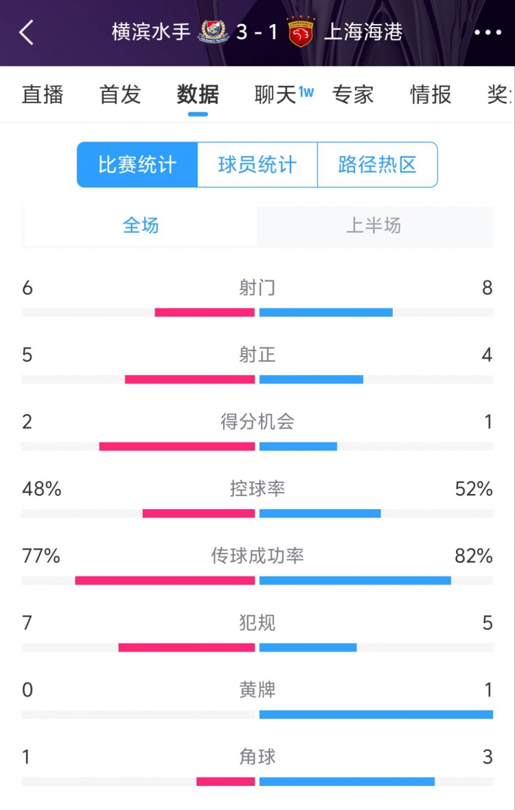 半場數(shù)據(jù)方面,射門數(shù)海港8-6領先,射正4-5落后,控球率52%、傳球成功率82%均高于橫濱。