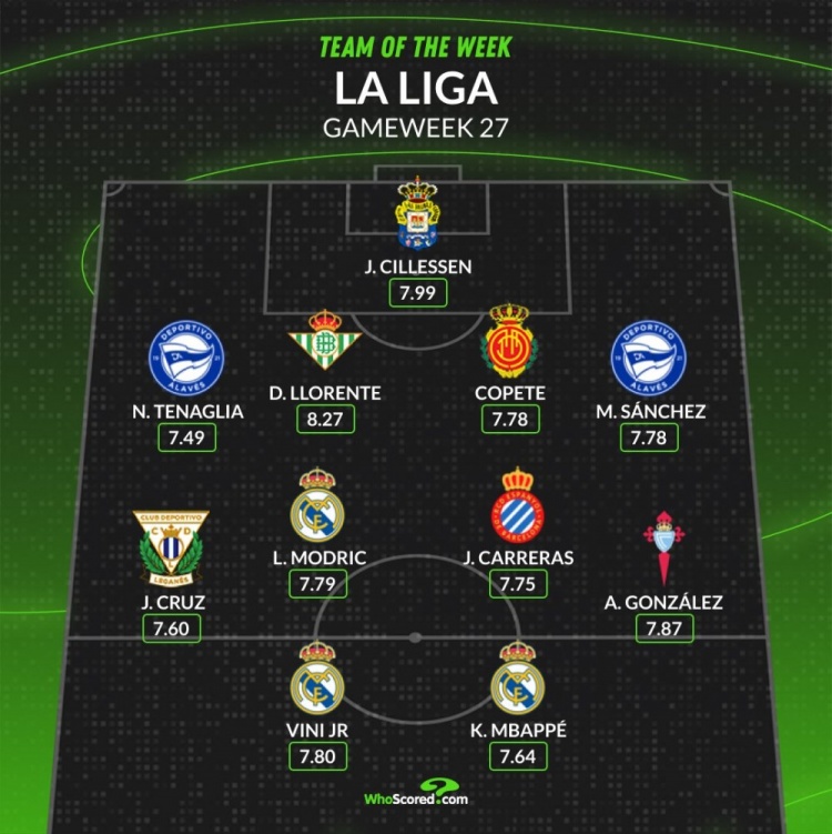 3月11日訊 西甲第27輪聯(lián)賽已經(jīng)完賽(巴薩vs奧薩蘇納延期),whoscored也列出了本輪評(píng)分最佳陣容,皇馬3將在列。