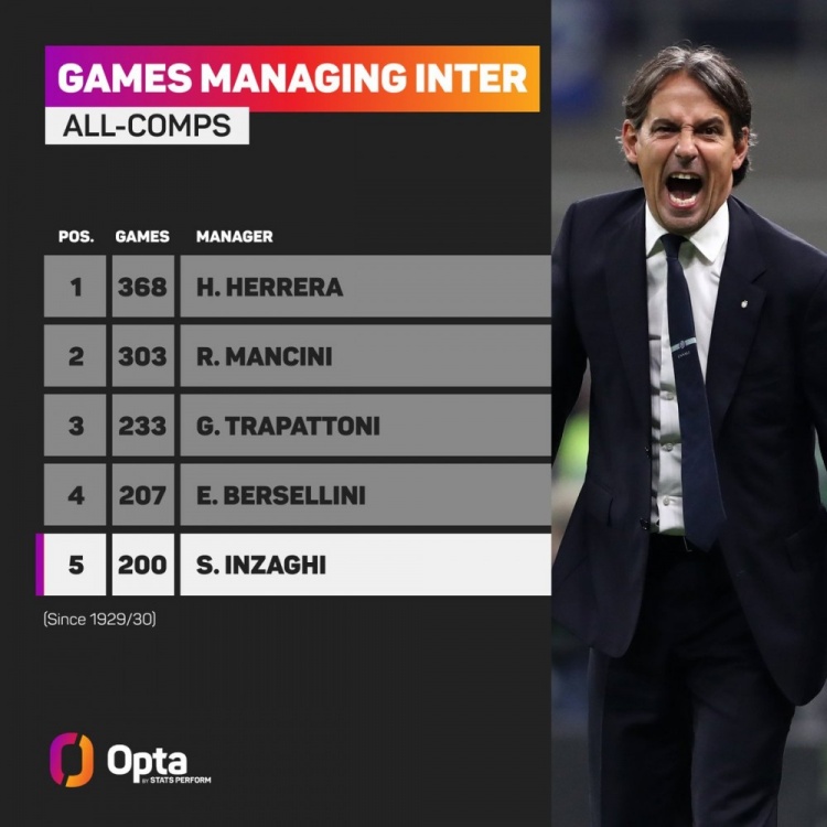 數(shù)據(jù)統(tǒng)計(jì)顯示,他也是1929-30賽季有統(tǒng)計(jì)以來(lái)第5位達(dá)成此成就的國(guó)米主帥。