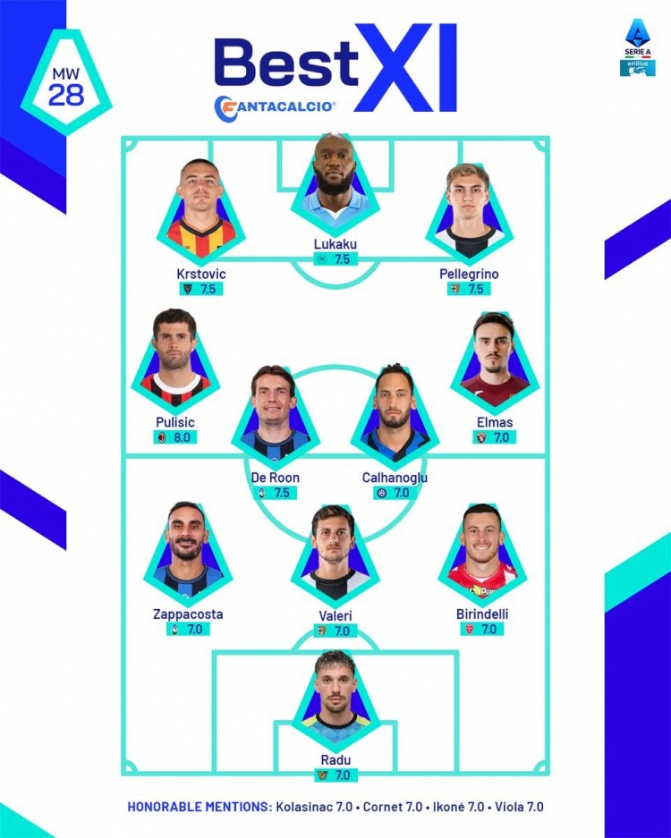 意甲官方本輪最佳陣:普利西奇、恰20領(lǐng)銜,盧卡庫(kù)、拉杜在列