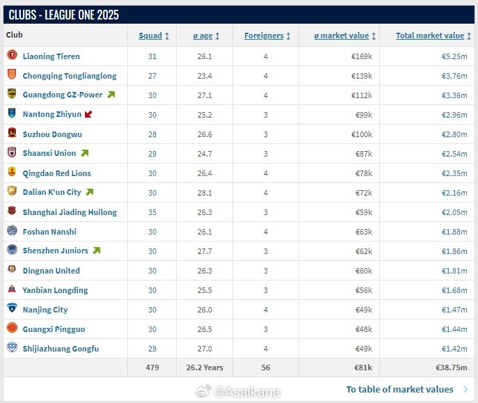 中甲聯(lián)賽各隊(duì)名單已在轉(zhuǎn)會市場更新。一線隊(duì)總身價(jià)最高的是遼寧鐵人,為525萬歐元,后面依次是重慶銅梁龍(376萬歐元)、廣東廣州豹(336萬歐元)、南通支云(296萬歐元)、蘇州東吳(280萬歐元)、陜西聯(lián)合(254萬歐元)、青島紅獅(235萬歐元)、大連鯤城(216萬歐元)、上海嘉定匯龍(205萬歐元)、佛山南獅(188萬歐元)、深圳青年人(186萬歐元)、定南贛聯(lián)(181萬歐元)、延邊龍鼎(168萬歐元)、南京城市(147萬歐元)、廣西平果(144萬歐元)、石家莊功夫(142萬歐元)。重慶銅梁龍是平均年齡最小的球隊(duì),為23.4歲;大連鯤城平均年齡最大,為28.1歲。