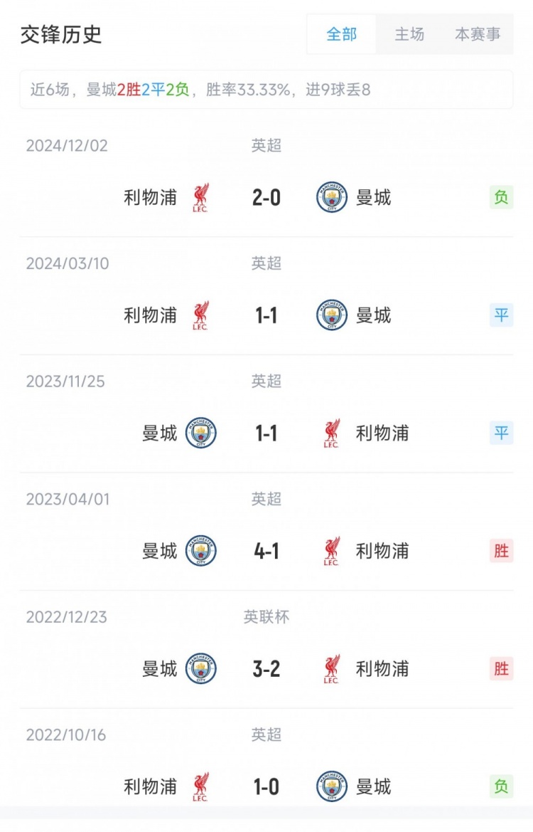 而兩隊(duì)近6次交鋒(5次英超1次聯(lián)賽杯),利物浦和曼城各取2勝,另外2場平局。在此期間,利物浦打進(jìn)8球,2次零封對手,曼城打進(jìn)9球,未能零封對手。