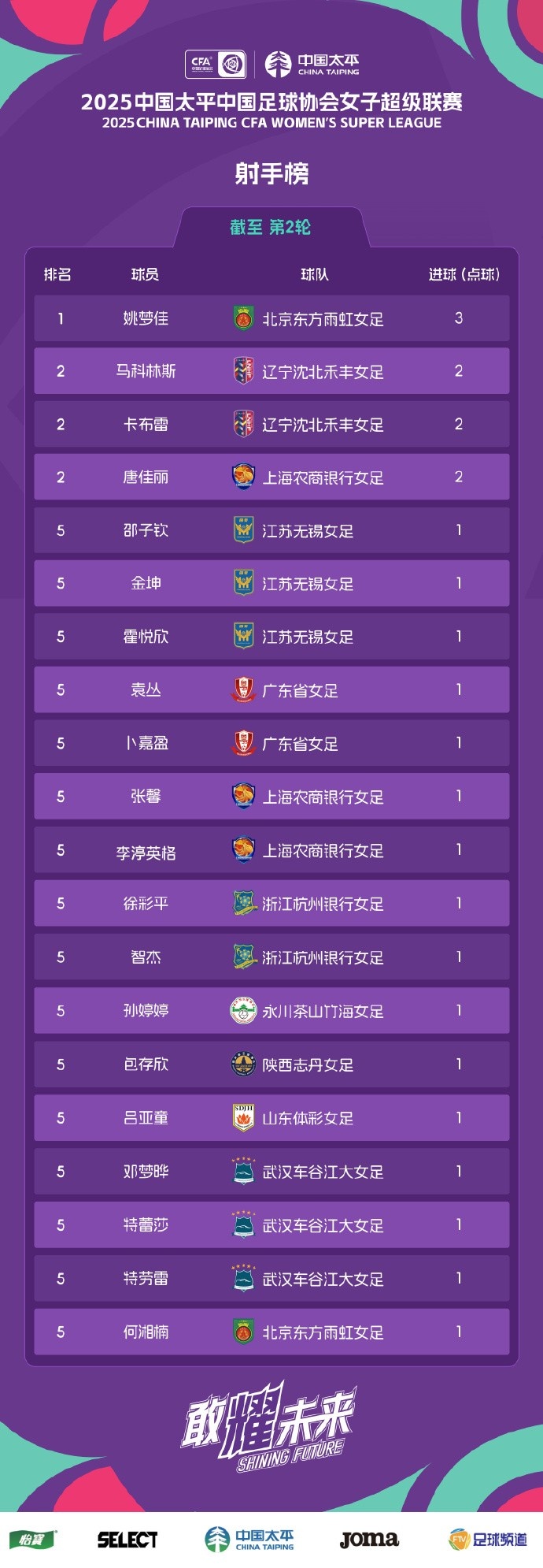 2025中國(guó)太平女超聯(lián)賽第2輪射手榜 ???