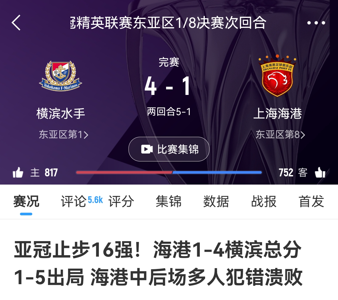 昨天的比賽中,海港客場1-4慘敗橫濱,總比分1-5遭淘汰。