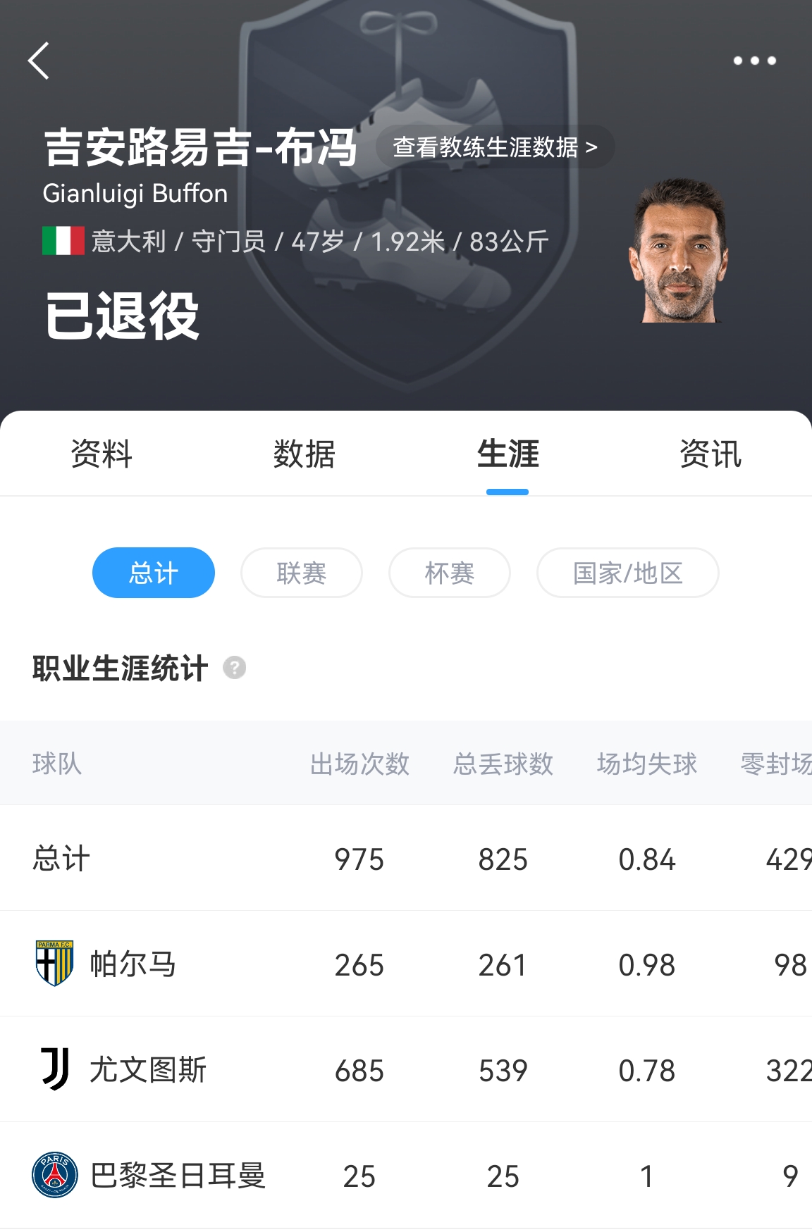 2023年8月45歲的布馮宣布退役時(shí),他的俱樂(lè)部出場(chǎng)數(shù)達(dá)到了975場(chǎng),國(guó)家隊(duì)出場(chǎng)數(shù)達(dá)到了176次。