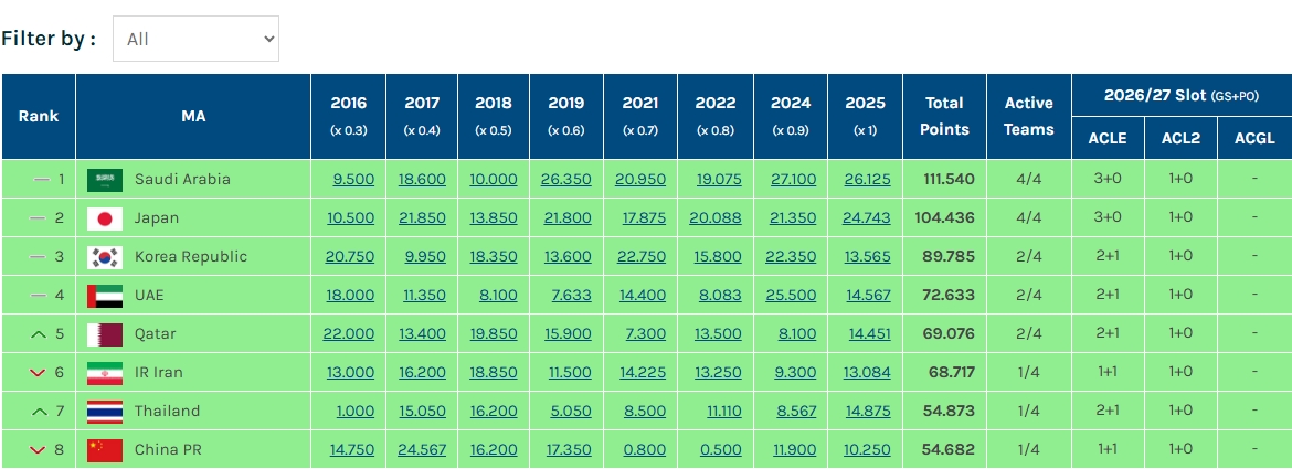 亞足聯(lián)俱樂部技術(shù)分實(shí)時情況
