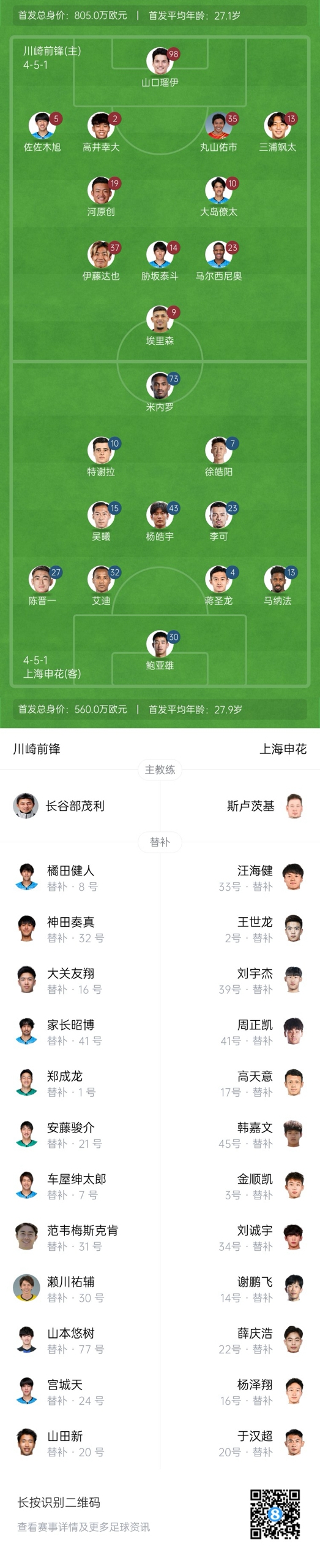 川崎前鋒首發(fā):98-山口瑠伊、2-高井幸大、5-佐佐木旭、13-三浦颯太、35-丸山祐市、10-大島僚太、14-脅坂泰斗、19-河原創(chuàng)、9-埃里松(F)、23-馬爾西尼奧(F)、37-伊藤達(dá)哉