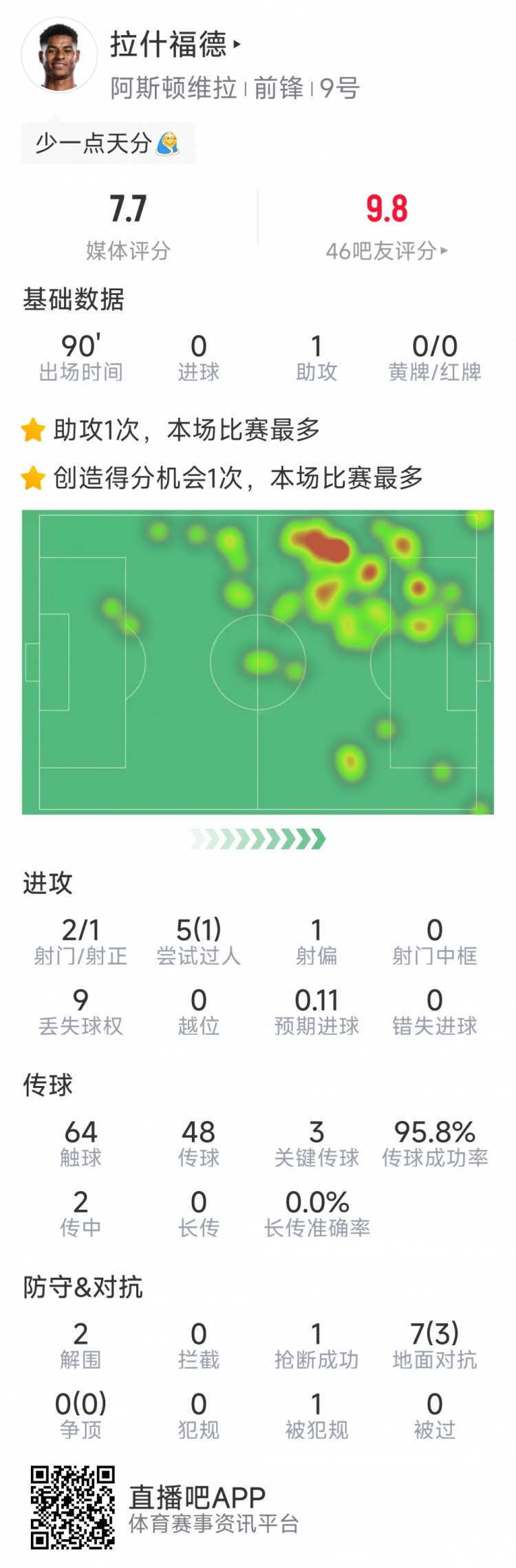 再送助攻,拉什福德本場(chǎng)數(shù)據(jù):1助攻,3次關(guān)鍵傳球,2次射門