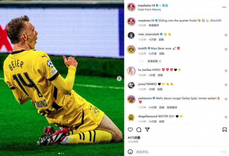 拜爾也曬出自己進球后的滑跪慶祝照,并調(diào)侃:“一路滑進歐冠八強!?????????? @多特蒙德俱樂部”。