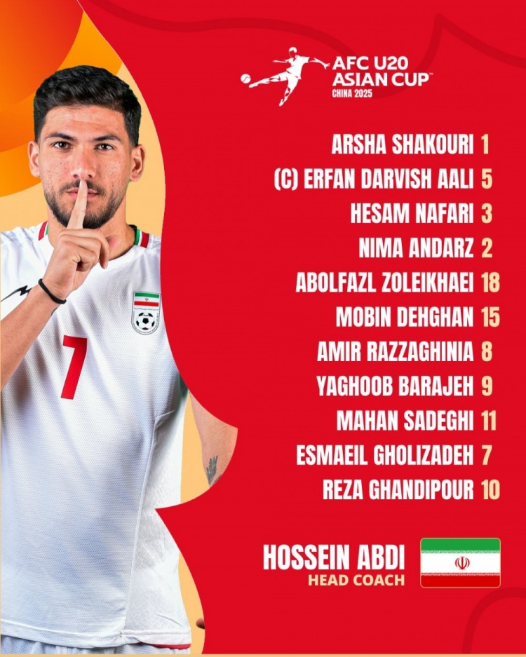 伊朗U20首發(fā):1-阿爾沙-沙庫(kù)里、18-阿博法茲-佐雷哈伊、3-希薩姆-納法里、5-埃爾凡-達(dá)爾維沙利、4-尼瑪-安達(dá)日、11-馬漢-薩德吉、15-莫賓-德甘、8-阿米爾穆罕默德-拉扎吉尼亞、9-雅古-布巴拉吉、7-埃斯梅爾-格霍利扎德、10-雷薩-甘迪普爾