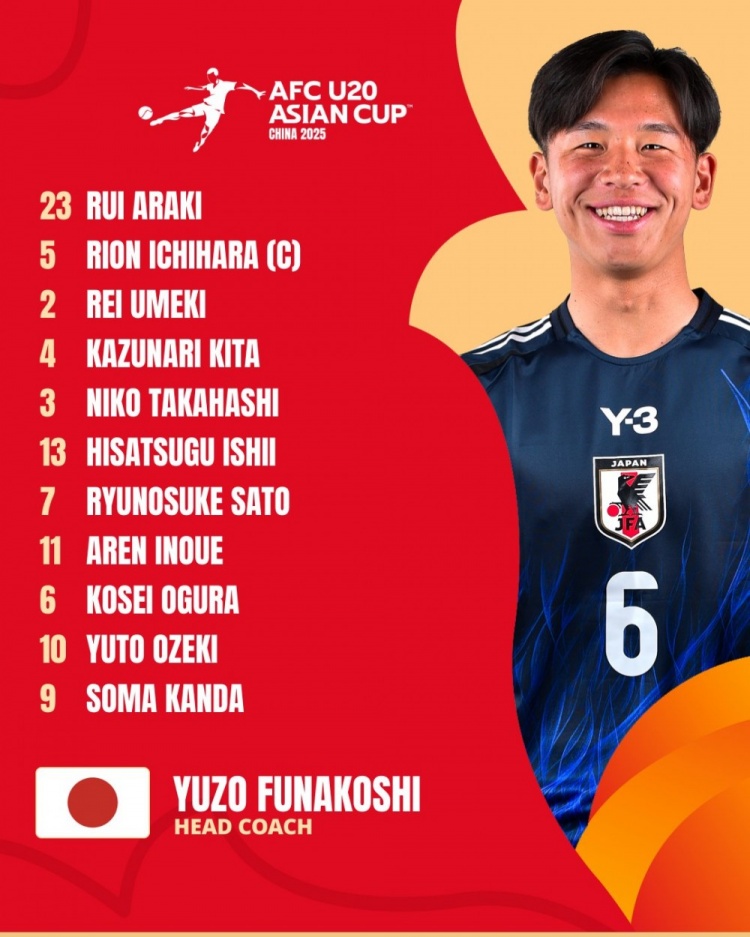 日本U20首發(fā):23-荒木琉偉、3-高橋仁胡、5-市原吏音、4-喜多壱也、2-梅木憐、13-石井久繼、7-佐藤龍之介、10-大關(guān)友翔、6-小倉(cāng)幸成、11-井上愛簾、9-神田奏真