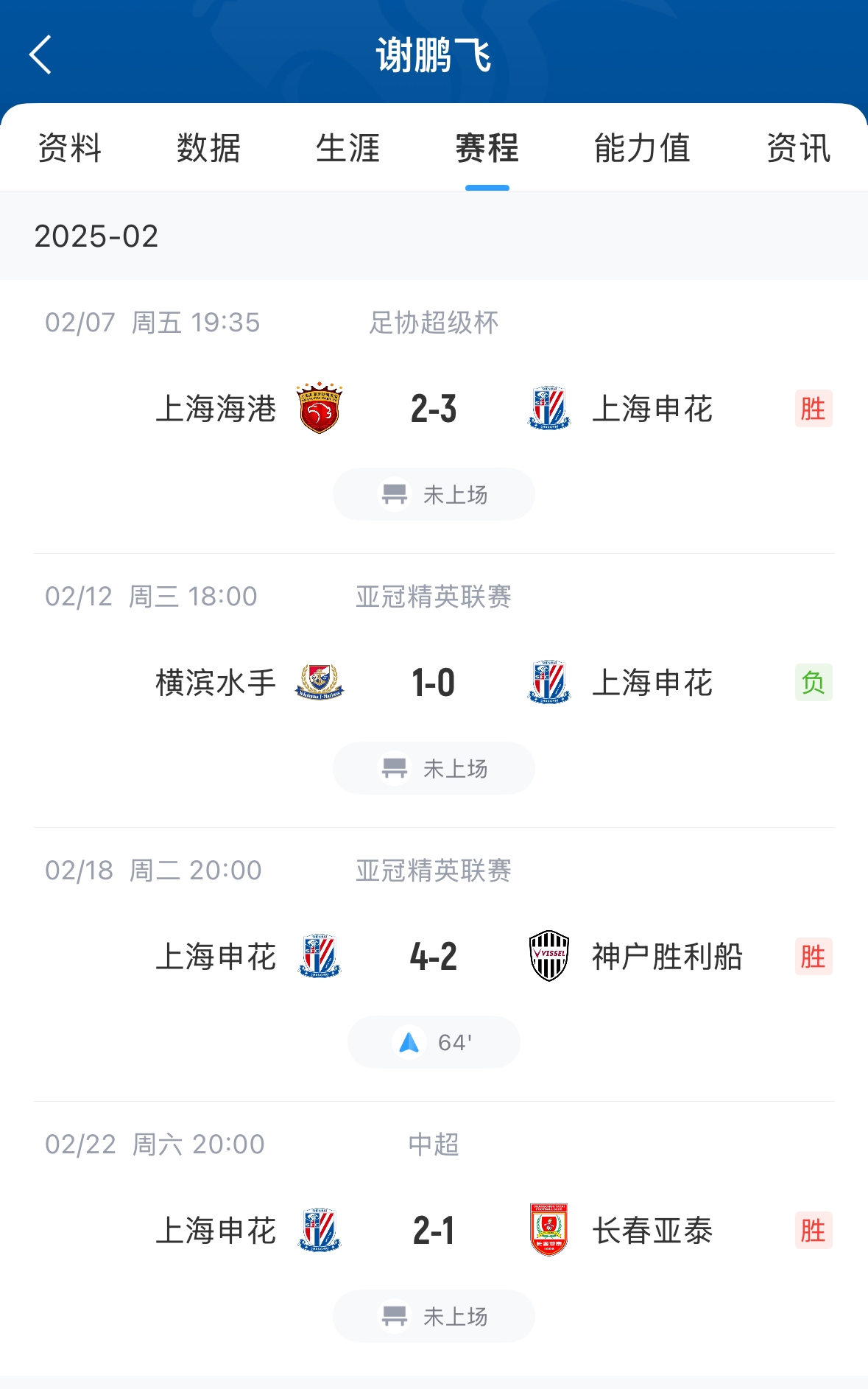 謝鵬飛本場(chǎng)比賽替補(bǔ)未出場(chǎng),謝鵬飛今年6月底滿32歲,本賽季目前代表申花只出場(chǎng)1次出場(chǎng)時(shí)間26分鐘,其余幾場(chǎng)比賽均未出場(chǎng)。