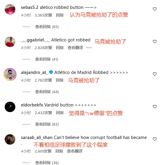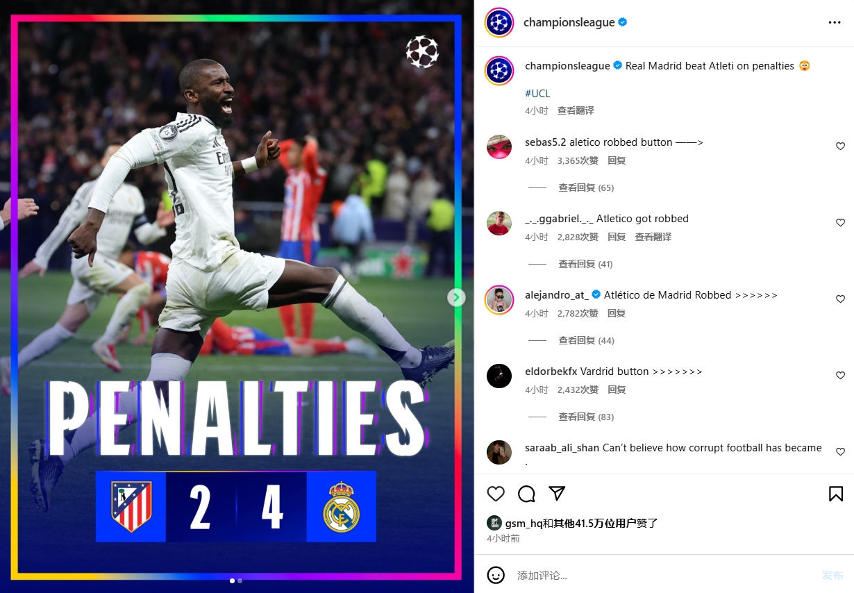 歐冠官方ins評(píng)論區(qū)被刷屏:馬競(jìng)被搶劫了 足球竟腐敗到這個(gè)地步