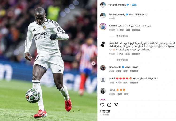 費蘭-門迪曬出自己的比賽照,并配文:“皇家馬德里????”