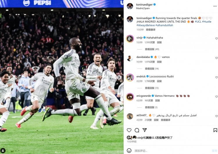 本場比賽呂迪格打進致勝點球,賽后他也在個人社媒曬出全隊瘋狂慶祝照,配文寫道:“沖向歐冠8強,Hala Madrid,永遠堅持到最后一刻!”