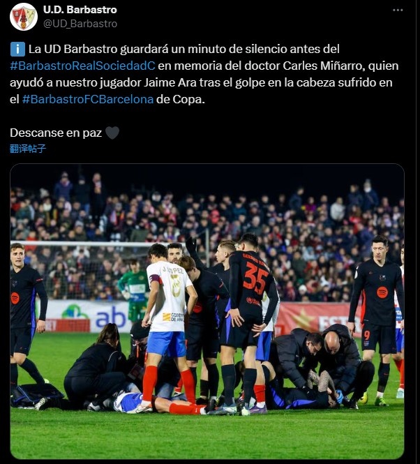 巴薩隊醫(yī)米尼亞羅近日不幸去世,而在今年1月初的國王杯比賽中,巴薩客場4-0戰(zhàn)勝了巴巴斯托,當時比賽第52分鐘,巴巴斯托球員海梅與伊尼戈發(fā)生了頭部碰撞,米尼亞羅則在場上為暈倒的海梅提供了傷口處理與醫(yī)療救助。