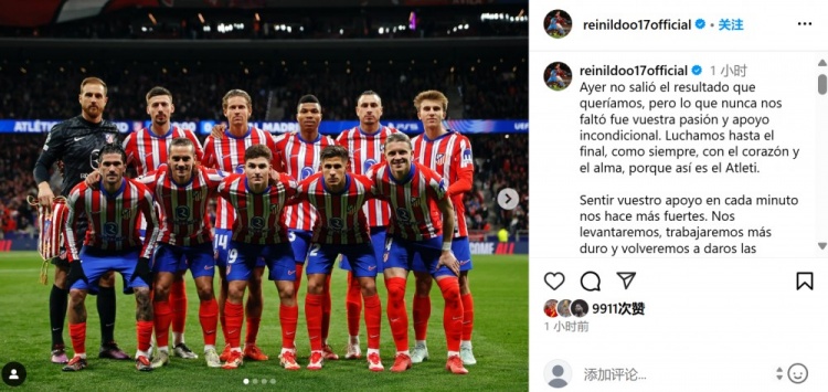 馬競球員雷尼爾多本場首發(fā)出戰(zhàn),他在個人社媒曬出全隊賽前合影,配文寫道:“昨天我們沒有得到想要的結(jié)果,但是我們從沒有缺少球迷的熱情和無條件的支持。我們一如既往拼搏到了最后一刻,因為我們是馬競。感受到你們的支持讓我們更加強大,我們會再次站起來,努力拼搏,并再一次帶給你們應(yīng)得的快樂。感謝大家來到球場支持,無論順境還是逆境,讓我們一直團結(jié)一致,加油馬競!”