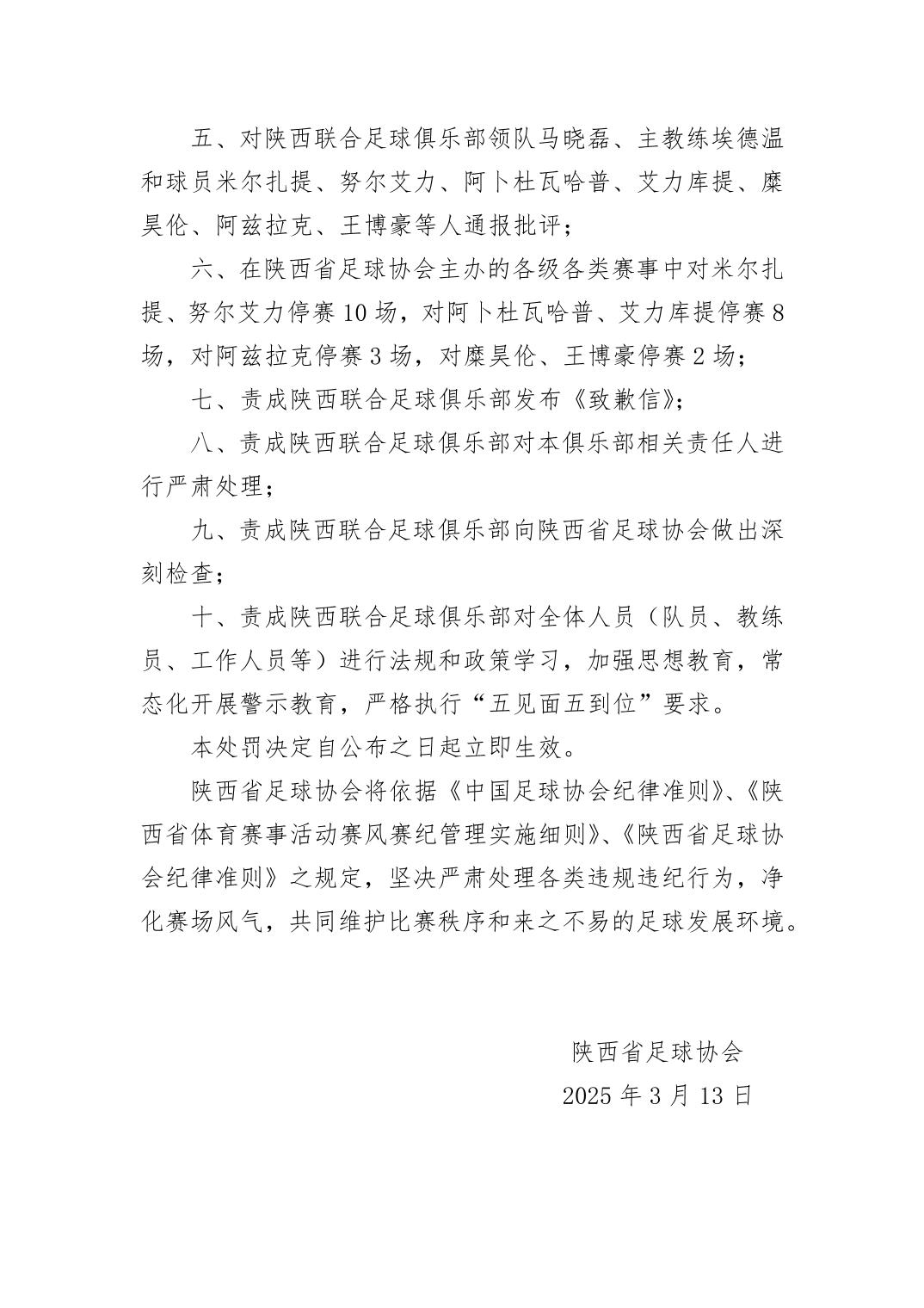 6、在陜西足球主辦的各級各類賽事中,對米爾扎提·艾力、努爾艾力·吐爾遜阿力停賽10場,對阿卜杜瓦哈普·艾尼瓦爾、艾力庫提·艾沙江停賽8場,對拉揚·埃爾阿茲拉克停賽3場。對糜昊倫、王博豪停賽2場。