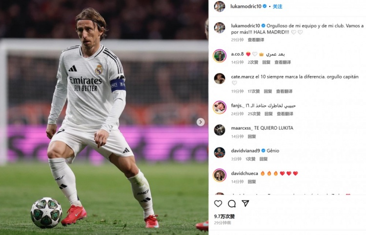 莫德里奇曬出自己的比賽照并配文:“我為我的球隊(duì)和俱樂部感到驕傲。讓我們繼續(xù)贏得更多?。?!馬德里前進(jìn)?。?!”