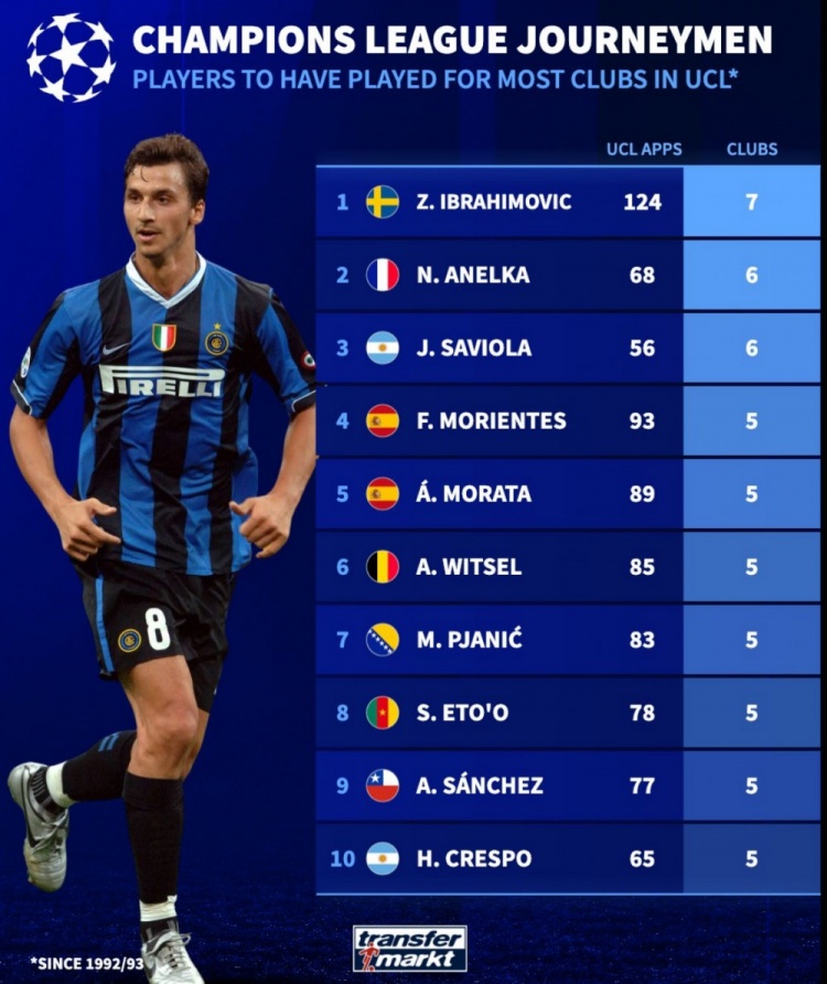 3月14日訊 轉(zhuǎn)會(huì)市場(chǎng)盤(pán)點(diǎn)了歐冠改制以來(lái),球員代表最多不同球隊(duì)參賽次數(shù)榜,伊布共代表7支球隊(duì)參賽居首,具體如下: