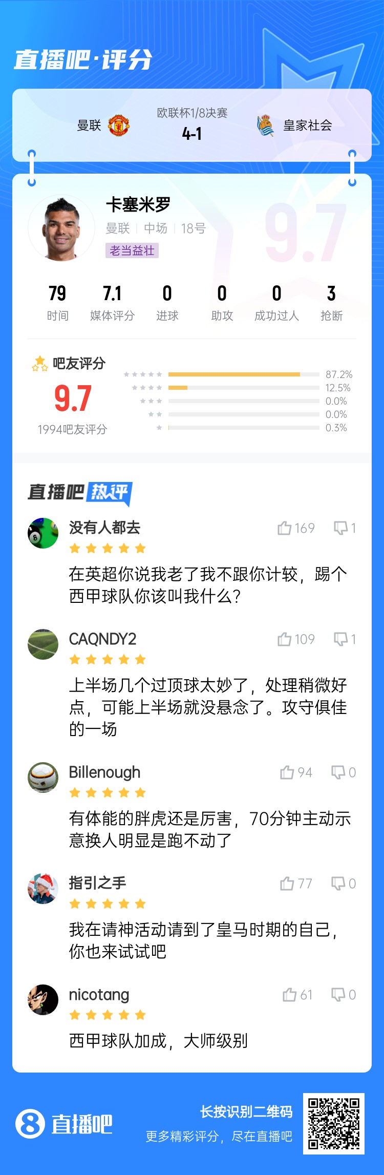 歐聯(lián)1/8決賽次回合,曼聯(lián)4-1戰(zhàn)勝皇家社會。卡塞米羅本場比賽首發(fā)出戰(zhàn)79分鐘,表現(xiàn)出色,賽后吧友給他打出9.7分的高分。