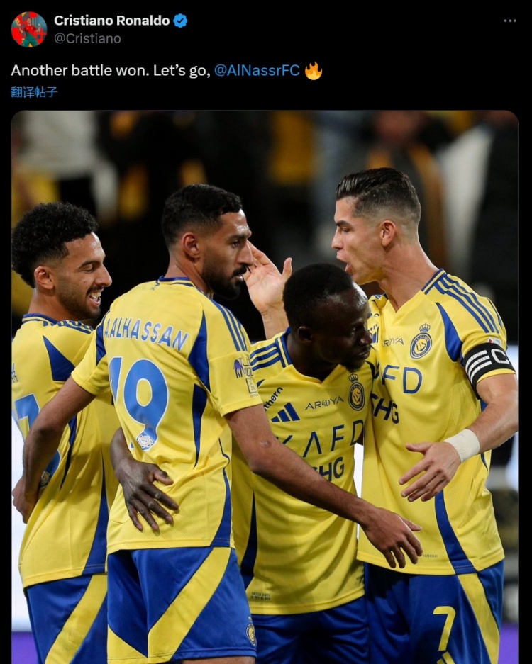 數(shù)據(jù)統(tǒng)計(jì)顯示這也是C羅生涯第928球,他也在賽后通過(guò)社媒曬出和隊(duì)友的慶祝照并配文:“又贏下一場(chǎng)戰(zhàn)斗,讓我們繼續(xù)前進(jìn)!@利雅得勝利俱樂(lè)部”。