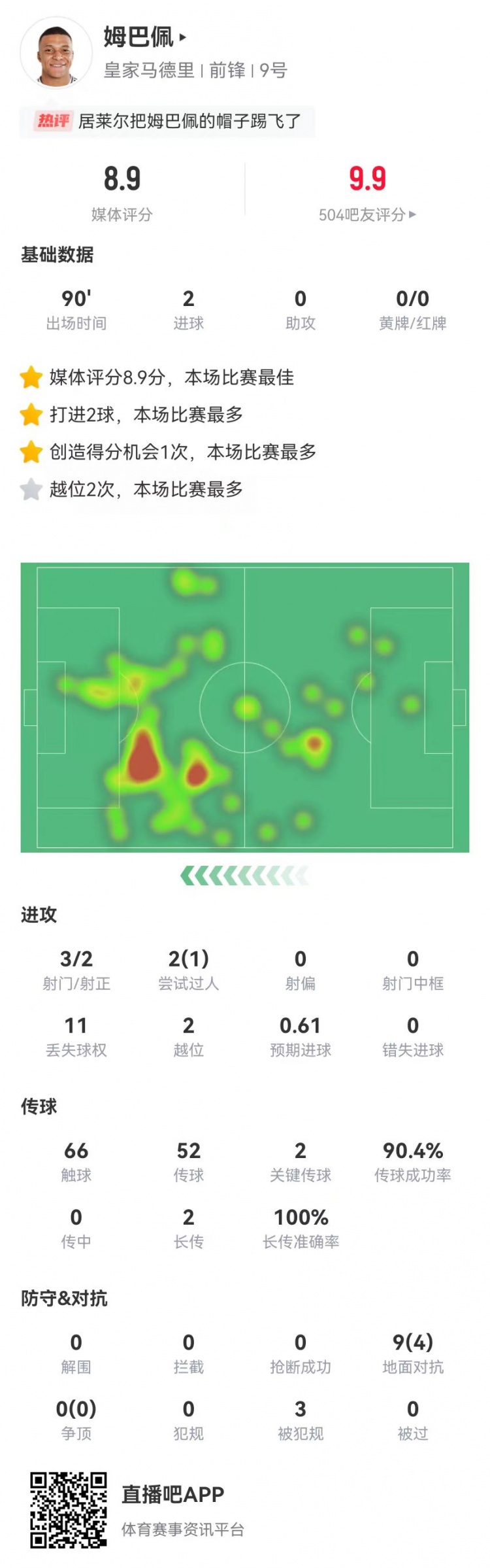 3月16日訊 皇馬在本輪西甲2-1逆轉(zhuǎn)黃潛,姆巴佩本場數(shù)據(jù)如下: