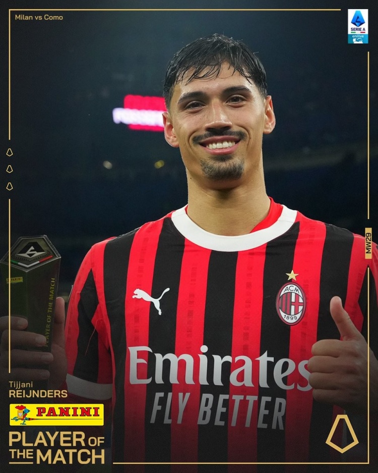 傳射建功!官方:賴因德斯當(dāng)選米蘭vs科莫全場最佳球員