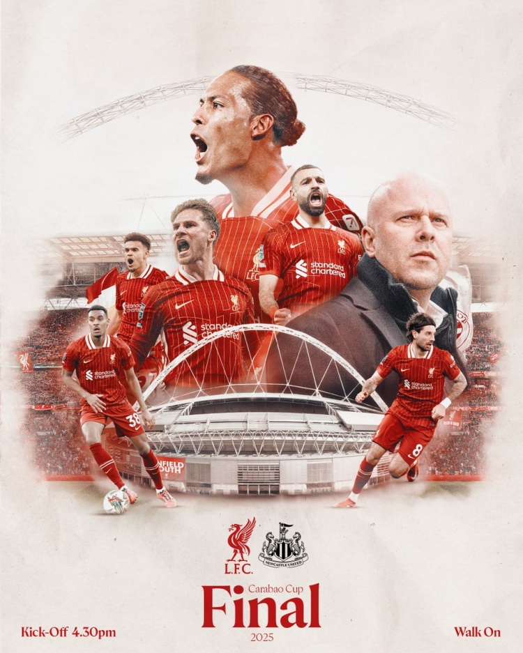 利物浦聯(lián)賽杯決賽海報(bào):斯洛特、薩拉赫、范迪克等人出鏡