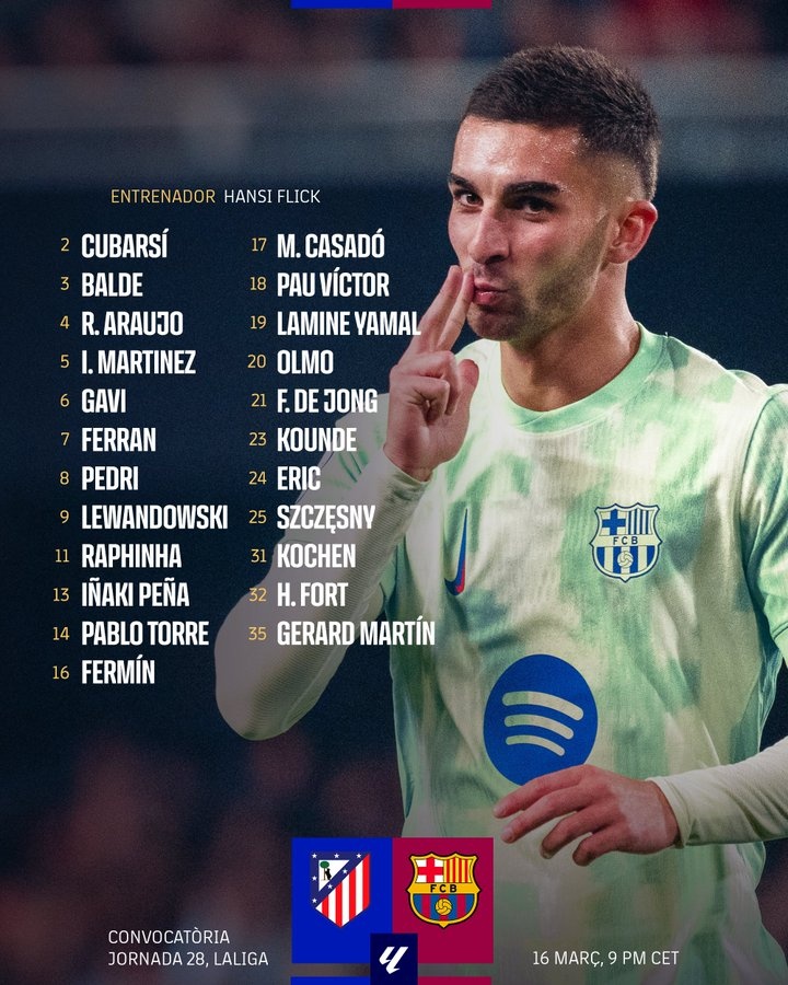 焦點大戰(zhàn)!巴薩客戰(zhàn)馬競名單公布:亞馬爾、萊萬、佩德里領銜