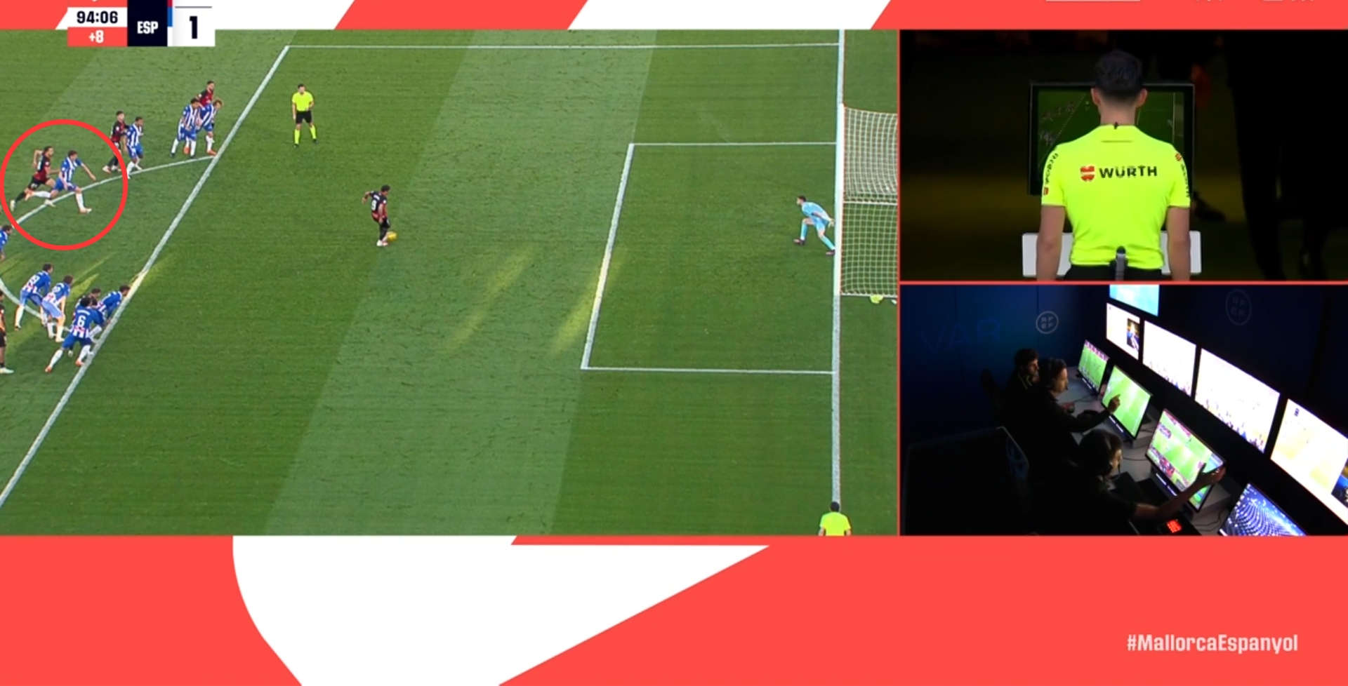 第92分鐘,VAR介入,主裁親自查看回放,此前西班牙人球員和馬略卡球員同時(shí)提前進(jìn)入禁區(qū)弧(距離點(diǎn)球點(diǎn)不滿9.15米),并對(duì)比賽產(chǎn)生影響,主裁判罰點(diǎn)球重罰↓