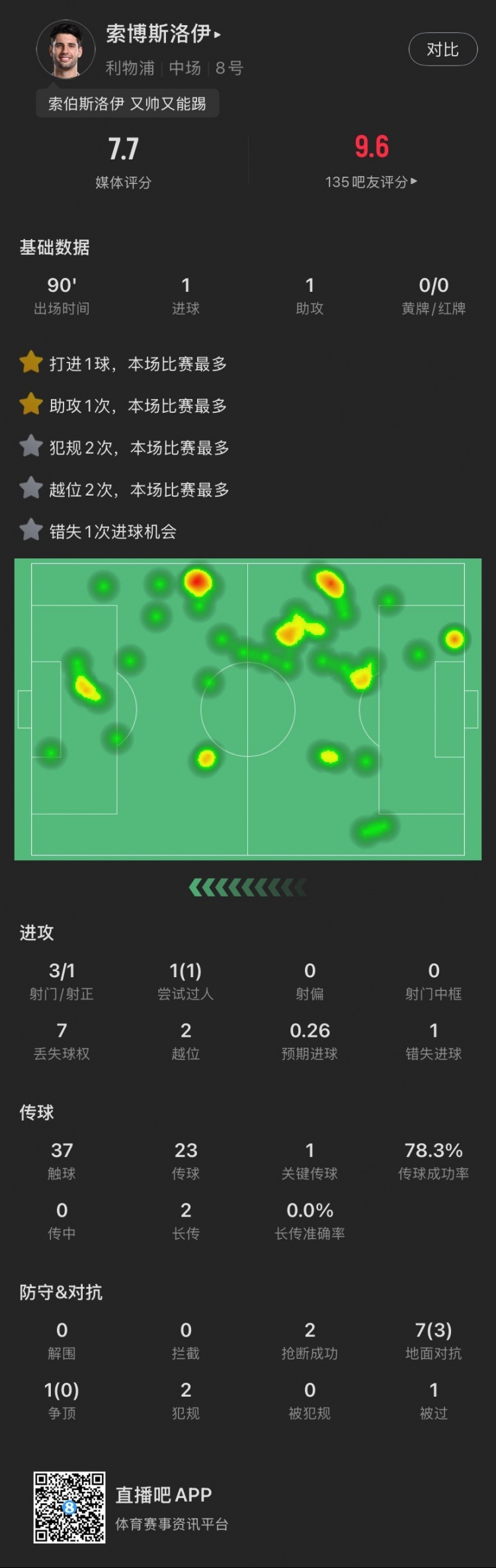 2月24日訊 在剛剛結(jié)束的英超本輪焦點(diǎn)戰(zhàn)中,利物浦2-0擊敗曼城。本場(chǎng)比賽,索博斯洛伊傳射建功,獲評(píng)7.7分。