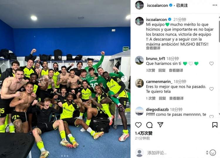 本場比賽伊斯科點(diǎn)射破門拉響反擊號(hào)角,賽后伊斯科也在社媒曬出更衣室內(nèi)全隊(duì)球員慶祝合影,配文寫道:“我的球隊(duì)????我們做到的事情值得被認(rèn)可,永不放棄太重要了。這是一場團(tuán)隊(duì)的勝利,現(xiàn)在是時(shí)候休息調(diào)整,以最高昂的斗志繼續(xù)前進(jìn)。貝蒂斯加油!”