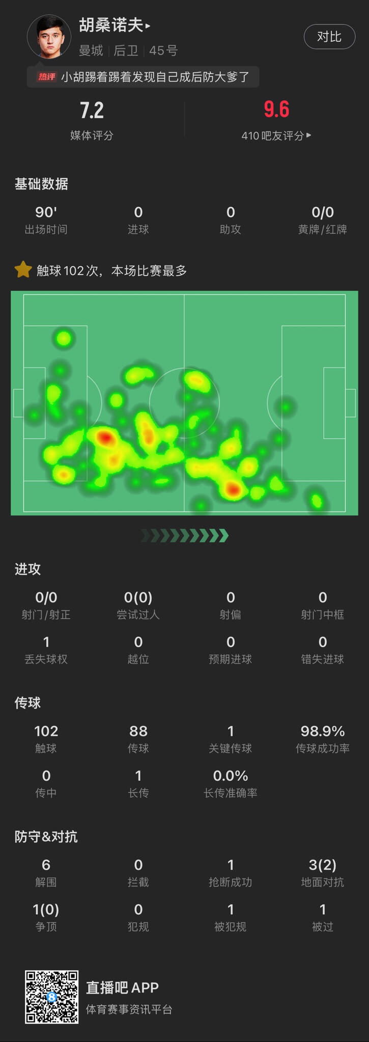 胡桑諾夫數(shù)據(jù):傳球成功率98.9% 6次解圍 媒體評分7.2分