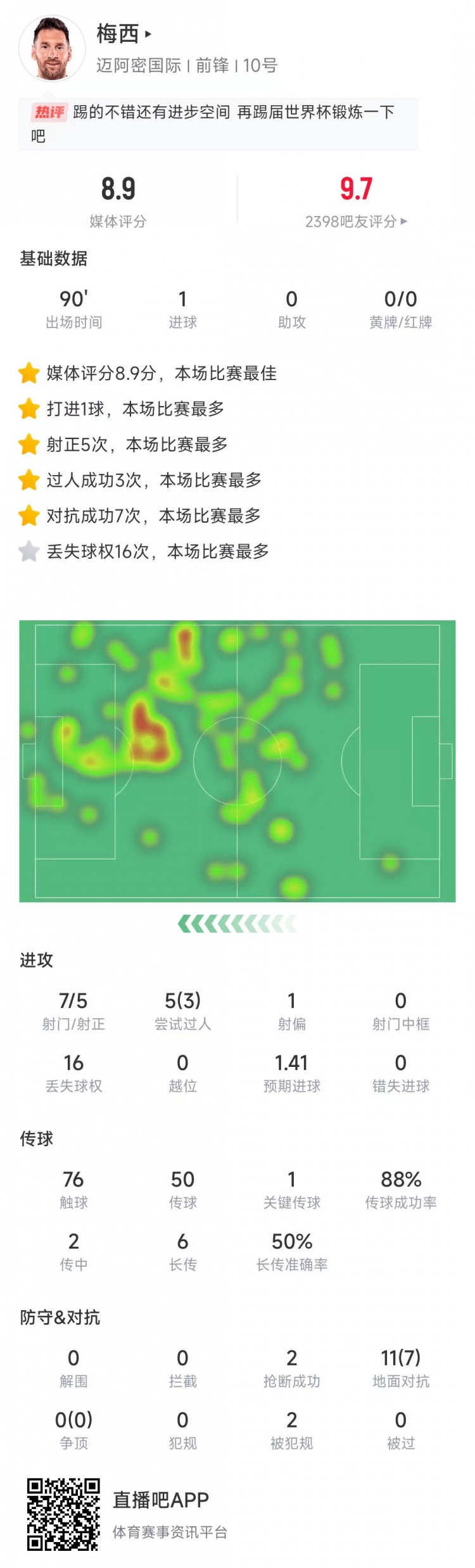挑射破門!梅西本場數(shù)據:7次射門5次射正,獲評8.9分全場最高