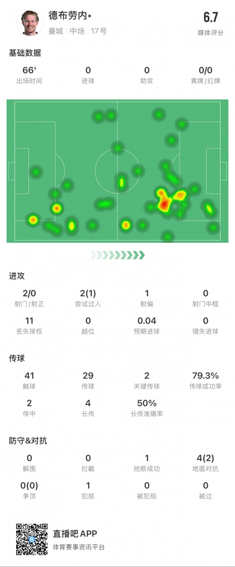 德布勞內(nèi)本場(chǎng)數(shù)據(jù):2次射門0次射正,2次關(guān)鍵傳球,1次搶斷