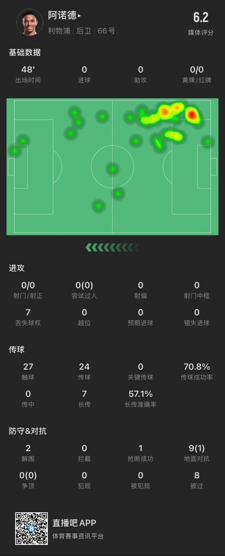阿諾德半場:被過8次追平本賽季紀錄,9次對抗成功1次,貢獻2解圍