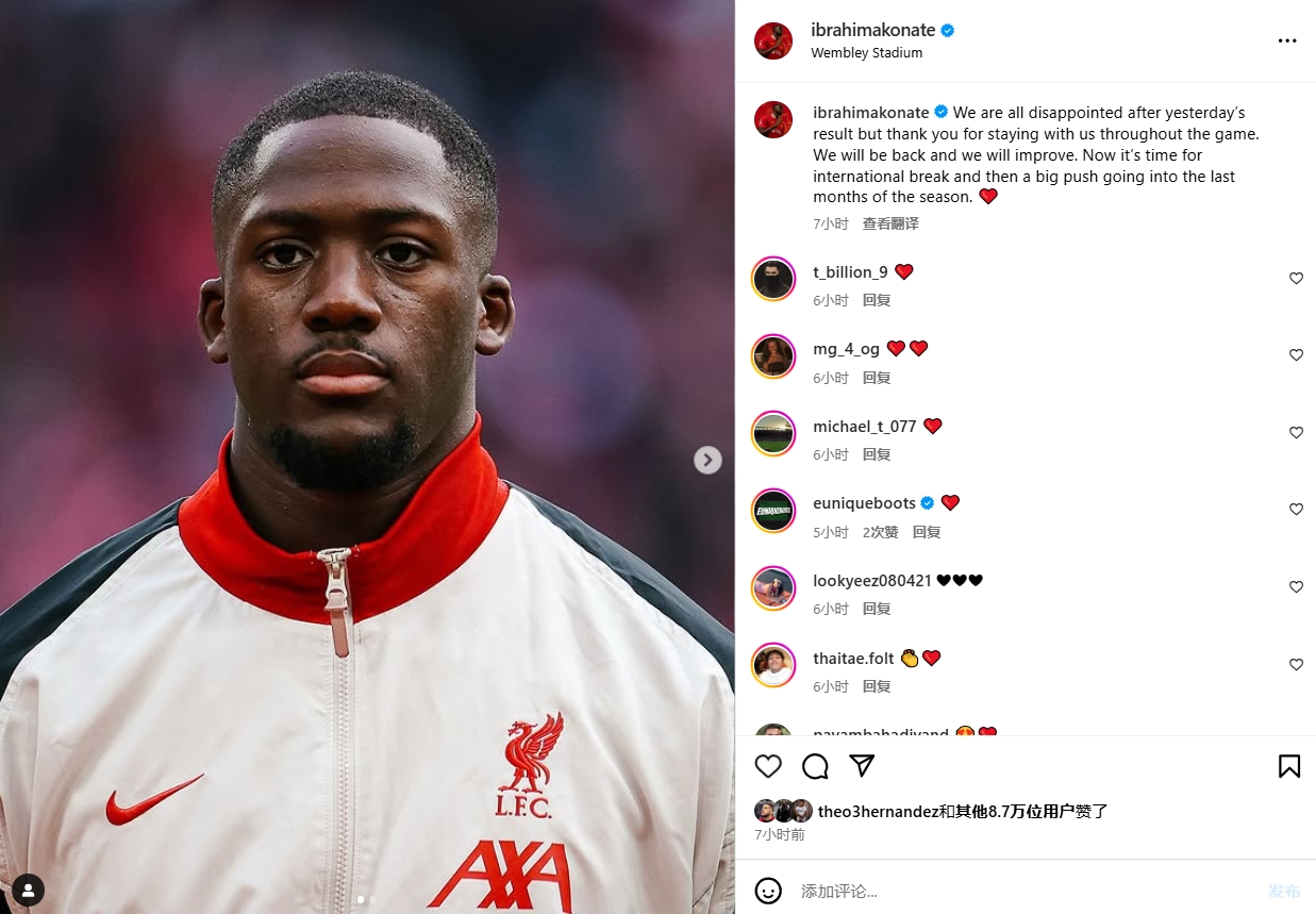 利物浦中衛(wèi)科納特在社交媒體上寫道:“昨天的比賽結(jié)果讓我們都很失望,但感謝大家整場比賽都與我們同在?!?/p>