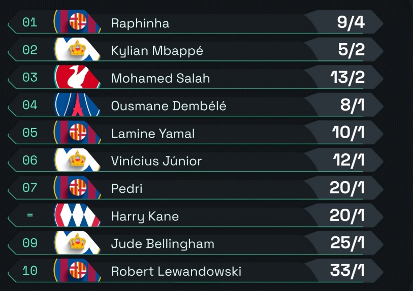 金球獎賠率:拉菲尼亞居首、姆巴佩第二,皇薩球員7人進前十